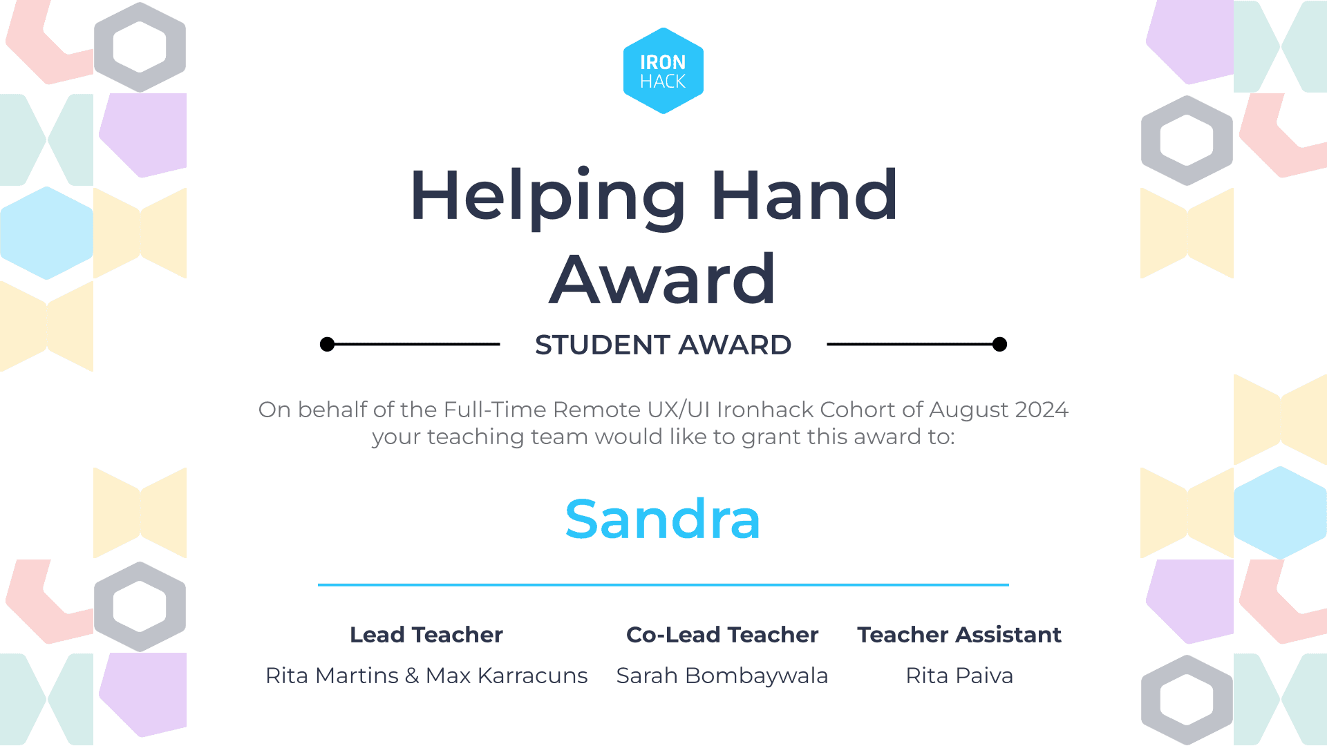 Oh, and I'm known for being genuinely helpful—not just in my family and among friends, but even during my bootcamp, where it earned me an award!